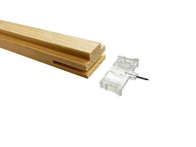 This mechanical fastener is made of clear polycarbonate plastic and fits into a slot parallel to the glass. The nail is 20 gauge metal and zinc coated for durability.